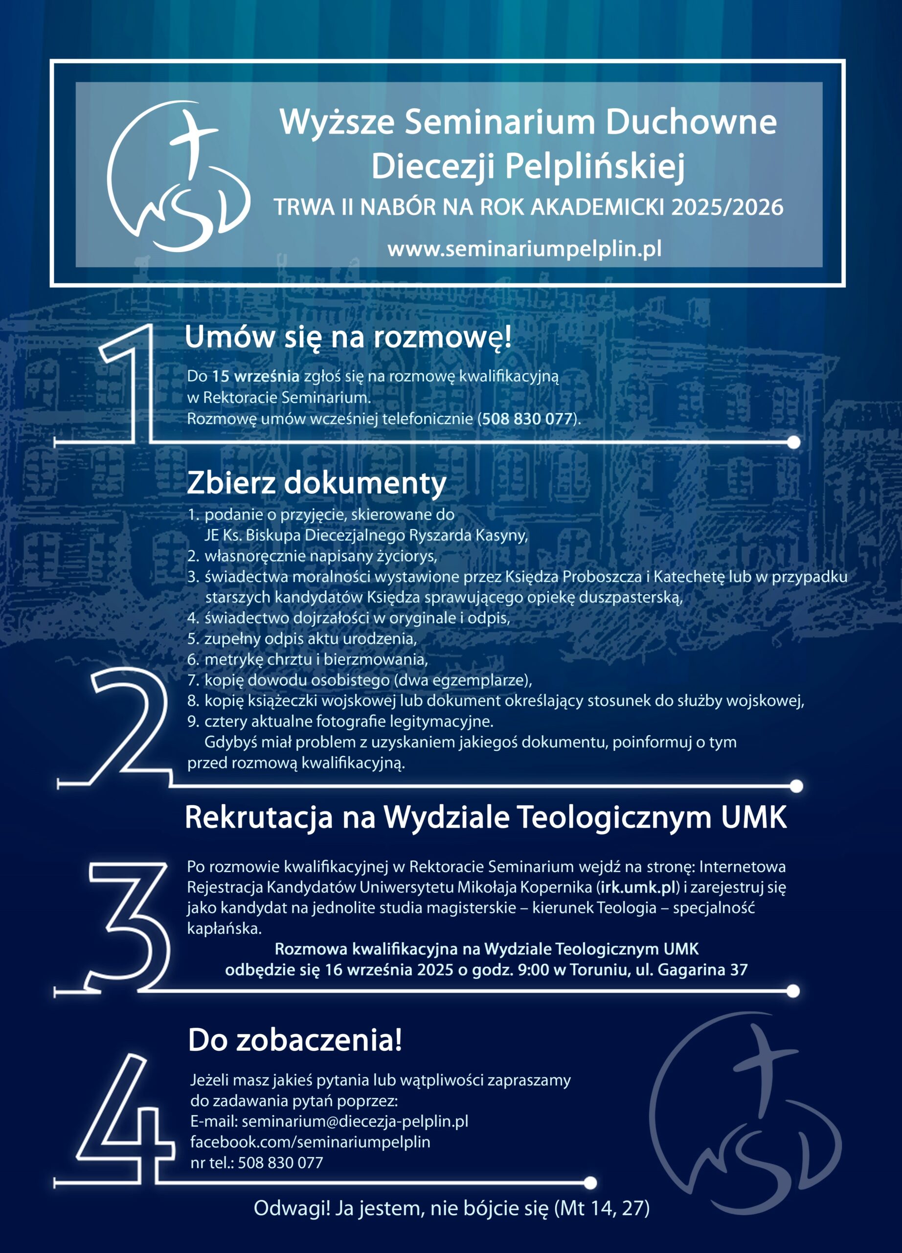 Wyższe Seminarium Duchowne Diecezji Pelplińskiej zaprasza młodych mężczyzn, którzy rozpoznają w sobie powołanie do kapłaństwa, do rozpoczęcia formacji i studiów w pelplińskim seminarium, które jest częścią Wydziału Teologicznego Uniwersytetu Mikołaja Kopernika w Toruniu. Kandydaci, w tym również tegoroczni maturzyści, proszeni są o zgłoszenie się do 12 września 2025 r. na rozmowę kwalifikacyjną w Rektoracie Seminarium (umówioną wcześniej telefonicznie 508 830 077) oraz o złożenie odpowiednich dokumentów rekrutacyjnych. Szczegółowe informacje na temat warunków przyjęcia są podane na stronie internetowej seminariumpelplin.pl.